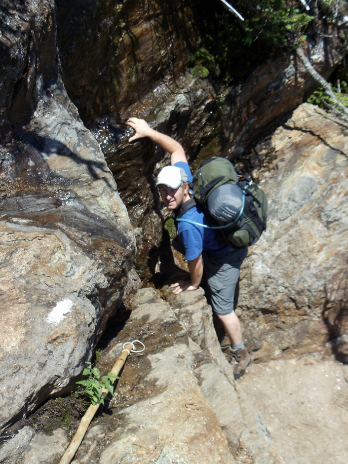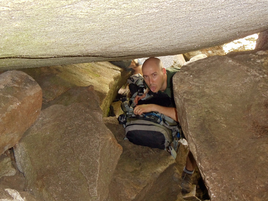 The trail, a loosely defined term in Mahoosuc Notch, led us scrambling over, around, and even under boulders as massive as dump trucks. In one spot we had to remove our packs in order to squeeze through a narrow cave. Such obstacles make the notch more technically challenging than physically demanding. All told it took us nearly two hours for this one mile, but as fun and memorable as it was, my vote for the MAT’s most difficult segment is cast for what came next.