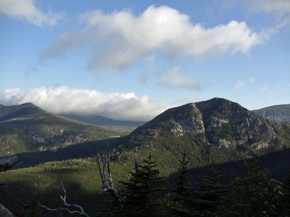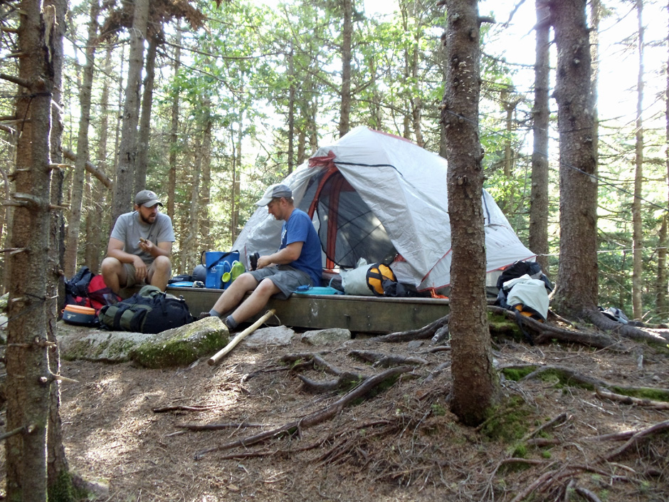 Our third night found us at the Frye Notch Lean-To. Located on a slope within the notch, the campsite was already sheltered from sunlight by mid afternoon, giving it a dark and gloomy appearance.