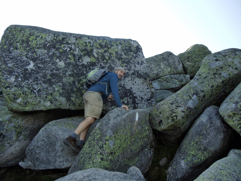 Day two included Mahoosuc Notch, a boulder-filled gorge widely regarded as the hardest mile on the entire Appalachian Trail. Cold air rose beneath our feet and lapped our faces as we dropped into the gorge. We had to remind ourselves that it was the Fourth of July at the sight of winter preserved beneath the giant rocks. Naturally, we did what you might expect from brothers. We had a snowball fight.