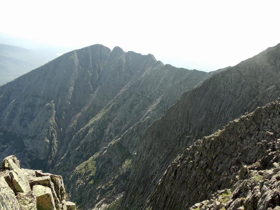 The first two miles begin with a gradual ascent through dense forest that speaks of the 100-Mile Wilderness. Next up is Katahdin Stream Falls, a tranquil reminder of the waterfalls in Dunn Notch and Gulf Hagas. The trail then becomes relentlessly steep climbing stone staircases that could be mistaken for those of White Cap Mountain. Katahdin’s tree line transported us back to Mahoosuc Notch with a boulder field every bit as challenging. Scrambling over the massive rocks with a fierce wind tugging at our clothes, we had the distinct feeling that one slip could send us spiraling off the face of the Earth.