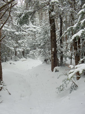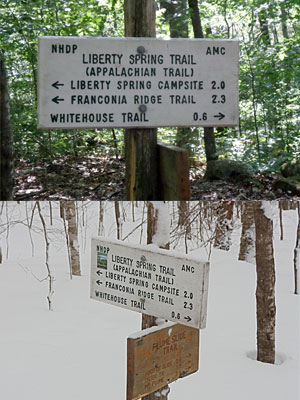 Being that the Liberty Springs Trail is also part of the Appalachian Trail within Franconia Notch State Park, the rock staircases and the trail in general is well maintained. The trail is a popular hike in all seasons (I met as many people on the trail on a Saturday in February as I did in September); as a result the snow was packed into a hard crust making for a relatively smooth climb. During both seasons there was a good half hour where I kept telling myself that I must be close to the Liberty Spring Campsite before I actually reached this waypoint. The campsite features several tenting platforms and a water source.